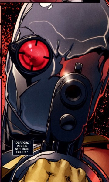 One of his most impressive, if not down-right impossible, feat of marksmanship was while he was free-falling from a mile-high drop to snipe an armored target with a round designed to punch through the target's power armor and, knowing that the bullet won't have enough momentum to kill the target, shoots another round THROUGH that hole and into the target, killing him. To top it all off, he then headshots the target's son with his wrist magnum, as to keep the son from seeking revenge. Now, there are many factors that Deadshot had to have counteracted before making the second shot: the distance (far enough that Deadshot needed to scope in, so likely one hell of a range), the hole (which was no larger than a dime, and it had moved when the target reeled from the first shot and Deadshot would have had to realign the shot to the right spot at the right angle at the right time), falling at terminal velocity (the base location would be constantly moving, and fast as hell), wind resistance (his body and the rifle would have to be taking wind force upward when falling at terminal velocity), and bullet drop (bullets still follow gravity; any sniper can tell you that). Add in the fact that Deadshot's rifle doesn't have a scope attached or even iron sights, that means Deadshot did a shot that NO real-world sniper, even the greatest, can even dream of making.